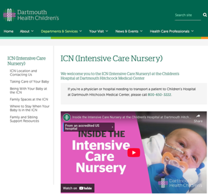 The Intensive Care Nursery (ICN) at Dartmouth Hitchcock Medical Center in Lebanon, NH has had a long-time commitment to family-centered care. The clinical leaders and staff have had a deep understanding that the family is an essential partner in their infant’s care. Fifty years ago, when the space for specialized newborn intensive care was only three beds in the adult ICU, physician leaders and nurses understood families’ importance to the health, well-being, and development of their infants and integrated them into the care team. Today, this commitment is evident in policy and practice and shown on the website. A video further describes the important roles of families in the ICN.
