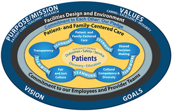 In 2008, a Care Transformation Model (see Figure 1) was developed to improve the patient experience at EHC. This model embraced patient- and family-centered care (PFCC) as its guiding principle and, from its inception, leadership has engaged the patient and family voice in order to influence their culture change. Patient and Family Advisory Councils (PFACs) were established that year and helped EHCimprove. On HCAHPS scores, specifically regarding “Likelihood to recommend,” EHC scored 33.7% in 2008 and improved to 86% by 2010.